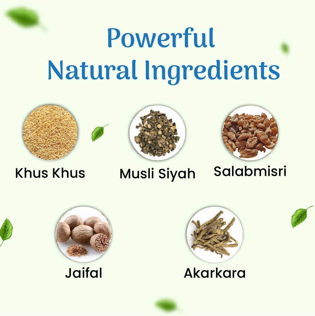 Our unique formula is enriched with time-tested natural ingredients such as Khus Khus, Musli Siyah, Salabmisri, Jaifal, and Akarkara, each valued for its traditional benefits. These carefully selected herbs work together to support natural vitality, improve stamina, and enhance overall performance. Crafted with the pure goodness of nature, this blend helps you feel stronger, more balanced, and confident in your daily life.